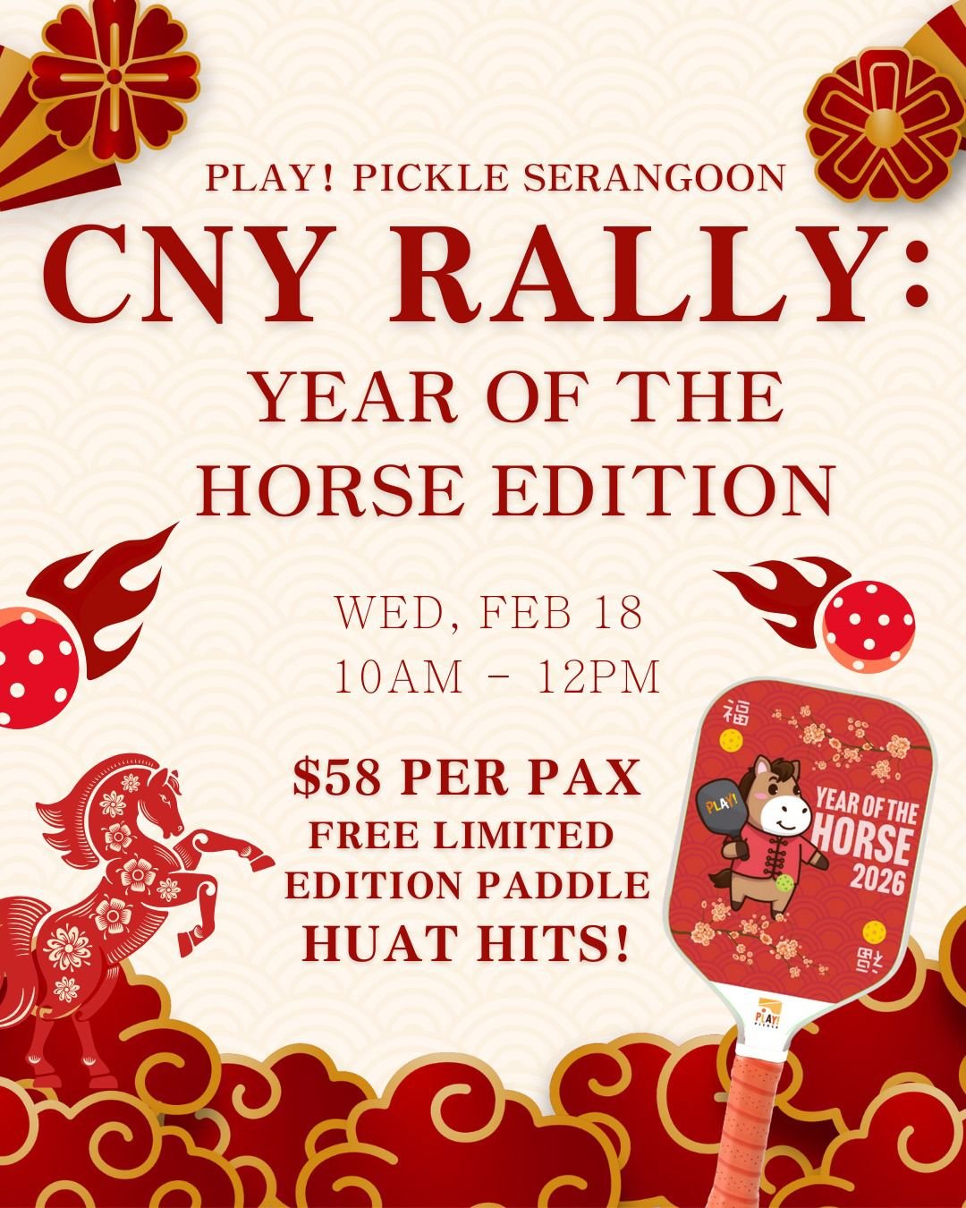 Celebrate Chinese New Year on court with a high-energy pickleball social at our air-conditioned Serangoon venue. Players will be grouped into the right courts for great rallies, smooth rotations, and an easy, friendly vibe — plus a special CNY door gift to take home.